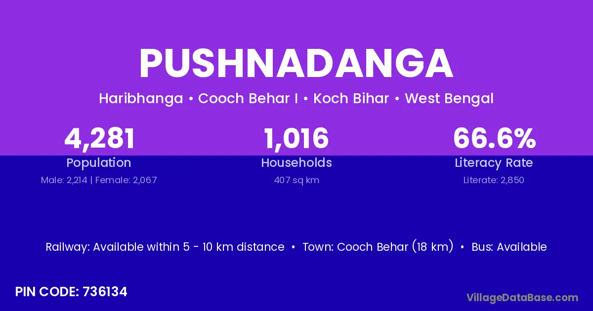 Cooch Behar (18 km) is the nearest town to Pushnadanga village for major economic activities and is located approximately 18 km away.