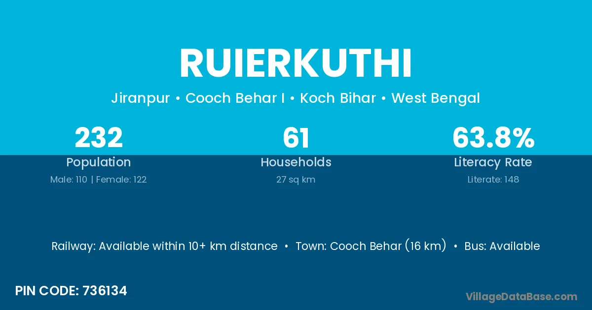 Cooch Behar (16 km) is the nearest town to Ruierkuthi village for major economic activities and is located approximately 16 km away.