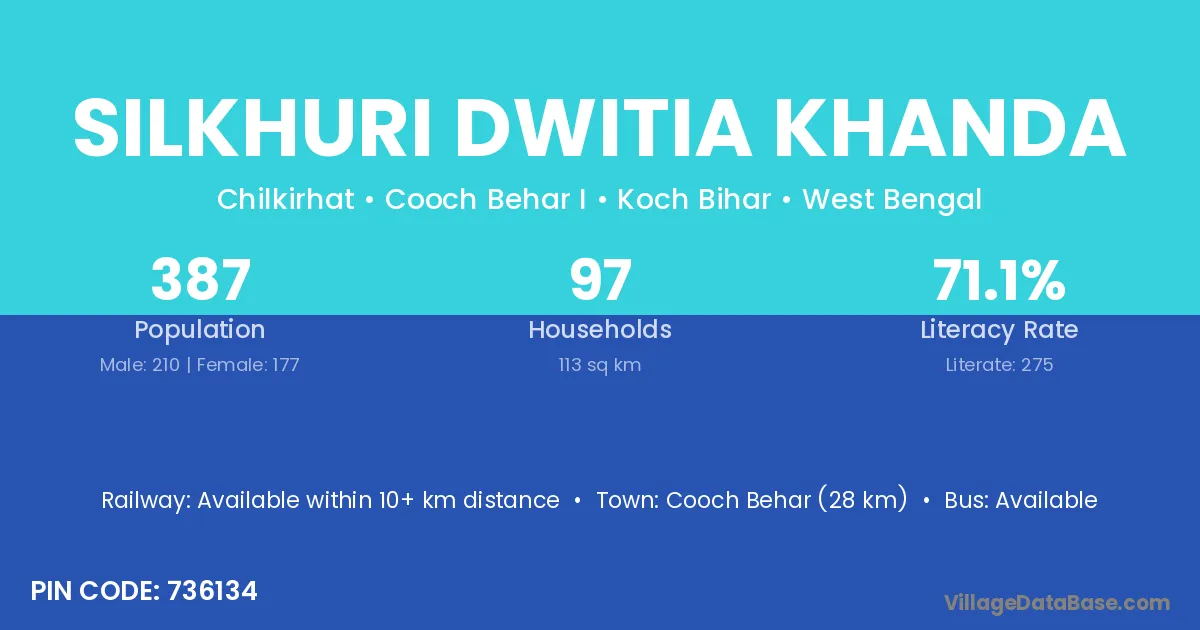Cooch Behar (28 km) is the nearest town to Silkhuri Dwitia Khanda village for major economic activities and is located approximately 28 km away.
