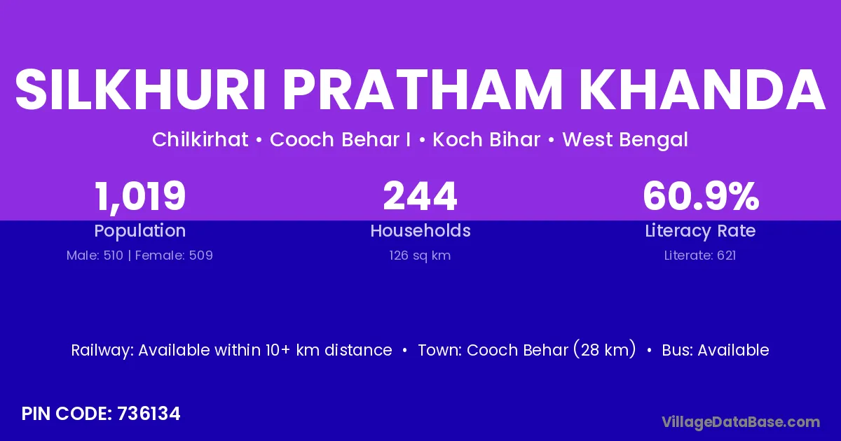 Silkhuri Pratham Khanda village has a total population of 1,019 people, of which 510 are males and 509 are females.