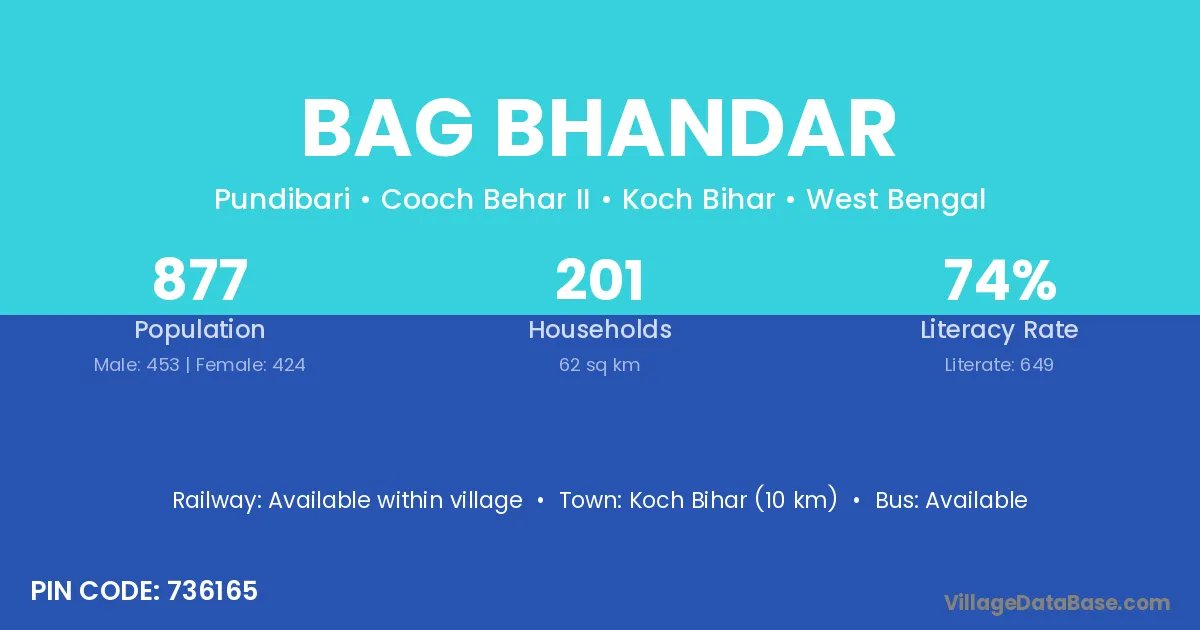 Koch Bihar (10 km) is the nearest town to Bag Bhandar village for major economic activities and is located approximately 10 km away.