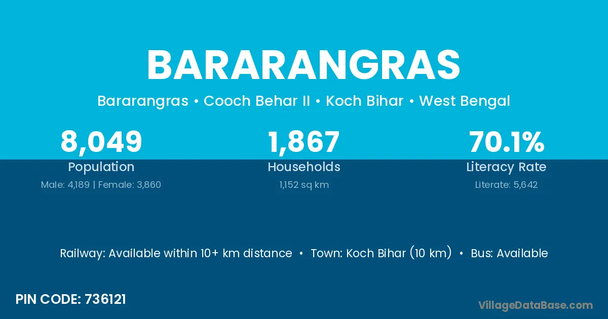 Koch Bihar (10 km) is the nearest town to Bararangras village for major economic activities and is located approximately 10 km away.