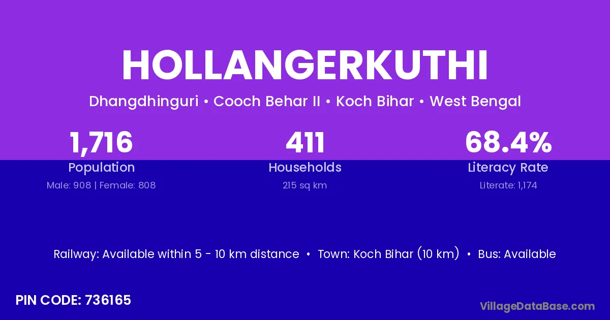 Koch Bihar (10 km) is the nearest town to Hollangerkuthi village for major economic activities and is located approximately 10 km away.