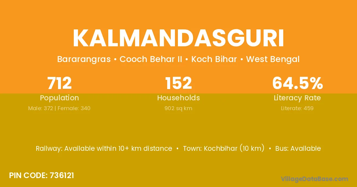 Kochbihar (10 km) is the nearest town to Kalmandasguri village for major economic activities and is located approximately 10 km away.