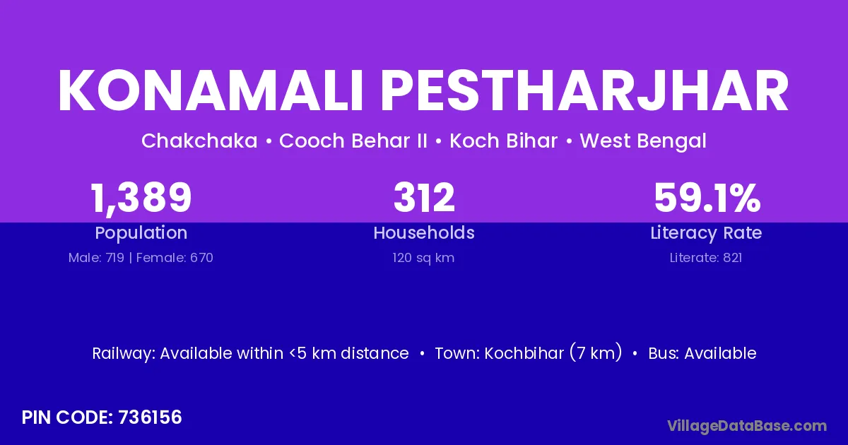 Kochbihar (7 km) is the nearest town to Konamali Pestharjhar village for major economic activities and is located approximately 7 km away.