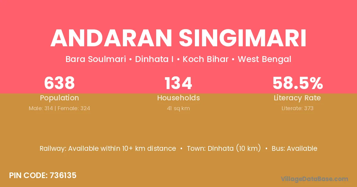 Dinhata (10 km) is the nearest town to Andaran Singimari village for major economic activities and is located approximately 10 km away.