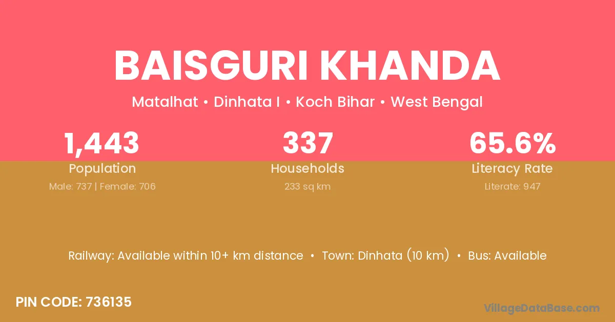 Dinhata (10 km) is the nearest town to Baisguri Khanda village for major economic activities and is located approximately 10 km away.