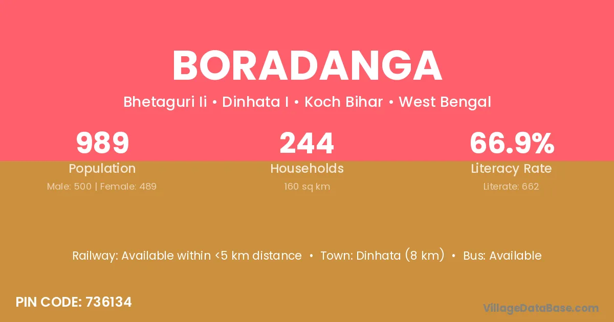 Dinhata (8 km) is the nearest town to Boradanga village for major economic activities and is located approximately 8 km away.