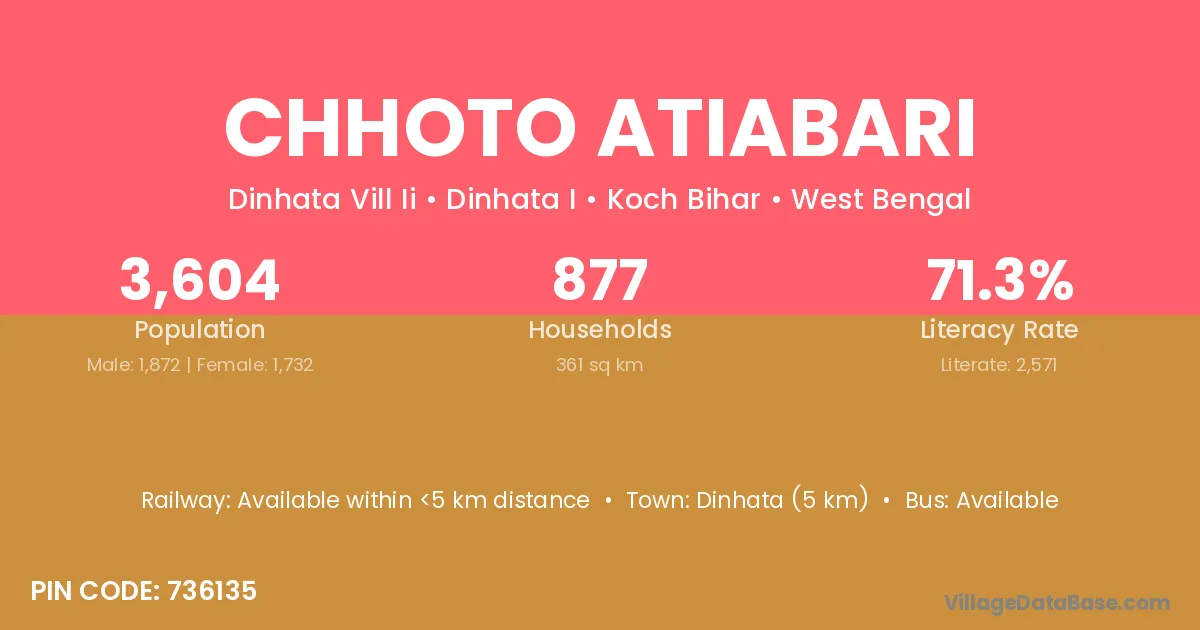 Dinhata (5 km) is the nearest town to Chhoto Atiabari village for major economic activities and is located approximately 5 km away.