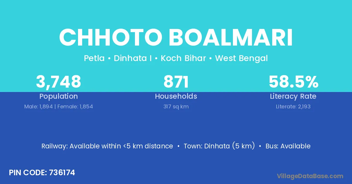 Dinhata (5 km) is the nearest town to Chhoto Boalmari village for major economic activities and is located approximately 5 km away.