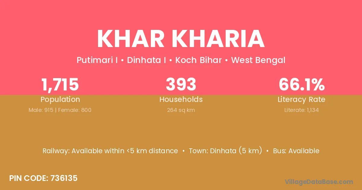 Dinhata (5 km) is the nearest town to Khar Kharia village for major economic activities and is located approximately 5 km away.