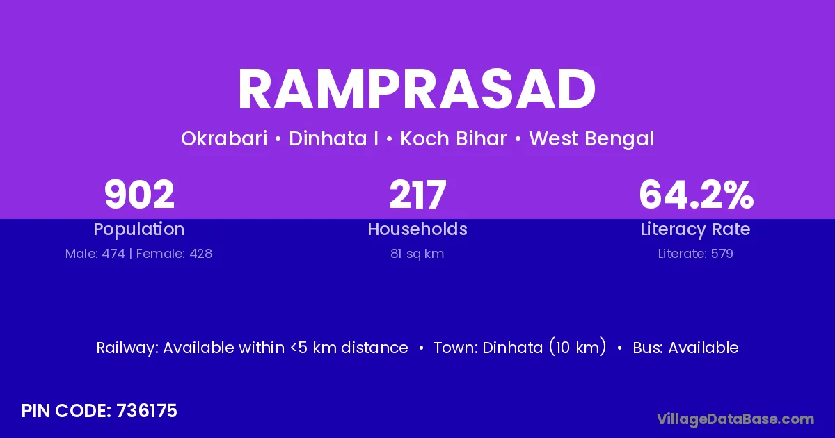 Dinhata (10 km) is the nearest town to Ramprasad village for major economic activities and is located approximately 10 km away.