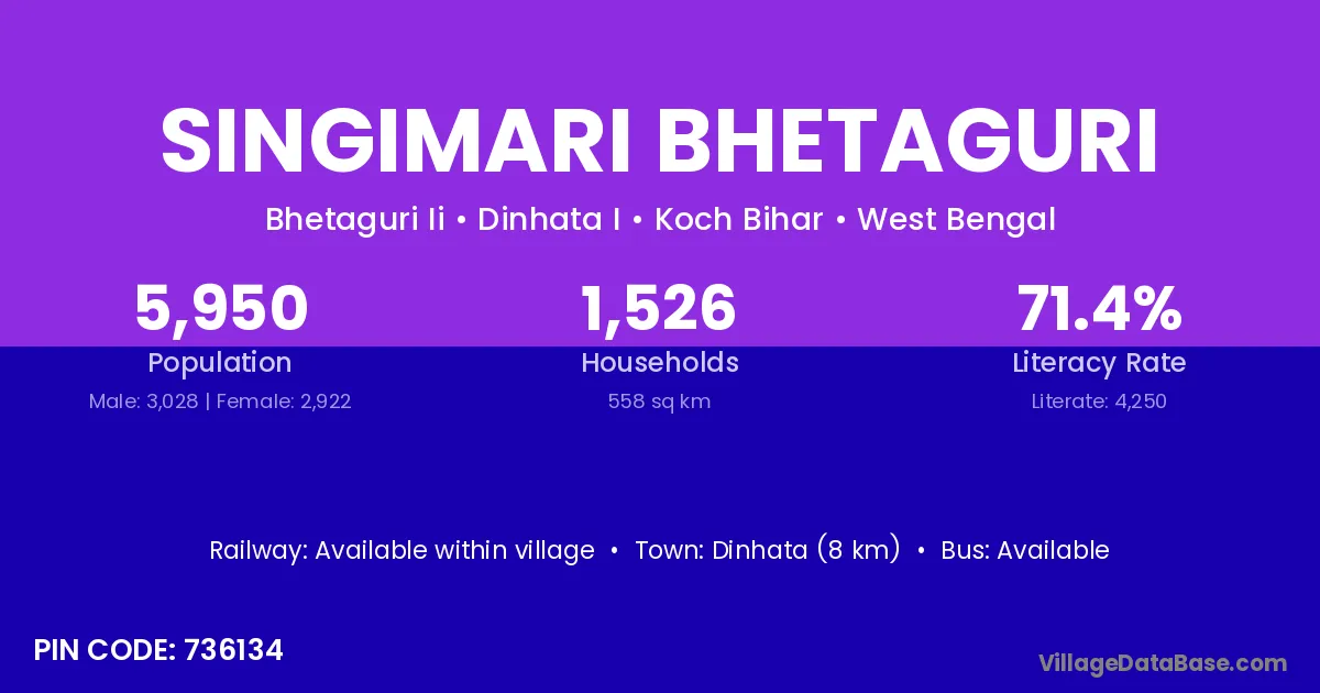 Dinhata (8 km) is the nearest town to Singimari Bhetaguri village for major economic activities and is located approximately 8 km away.