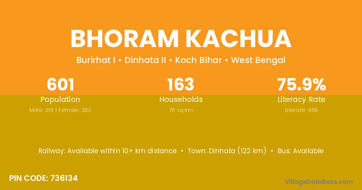 Dinhata (122 km) is the nearest town to Bhoram Kachua village for major economic activities and is located approximately 122 km away.