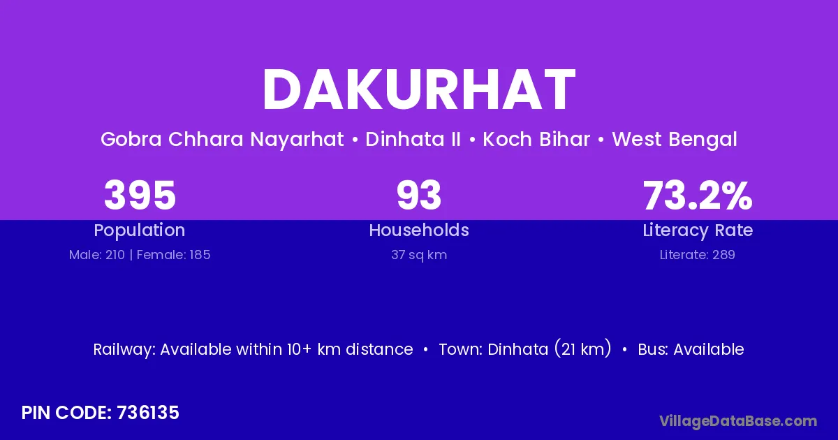 Dinhata (21 km) is the nearest town to Dakurhat village for major economic activities and is located approximately 21 km away.