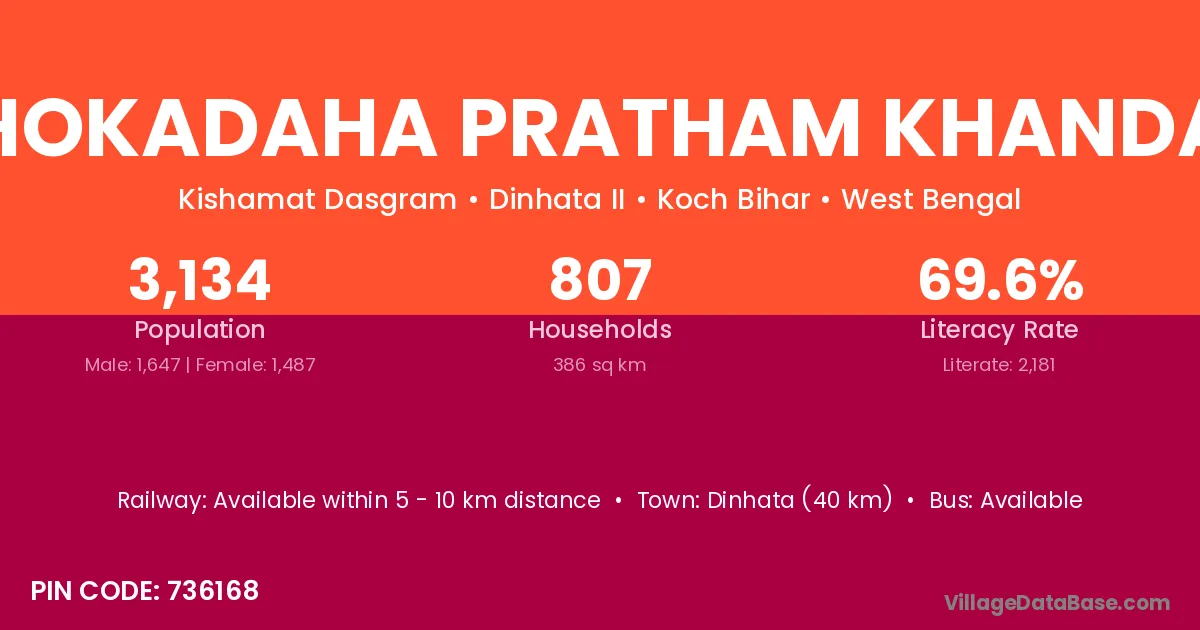 Dinhata (40 km) is the nearest town to Hokadaha Pratham Khanda village for major economic activities and is located approximately 40 km away.