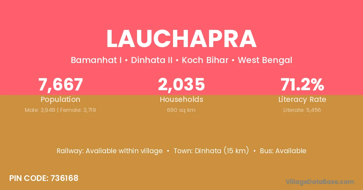 Dinhata (15 km) is the nearest town to Lauchapra village for major economic activities and is located approximately 15 km away.