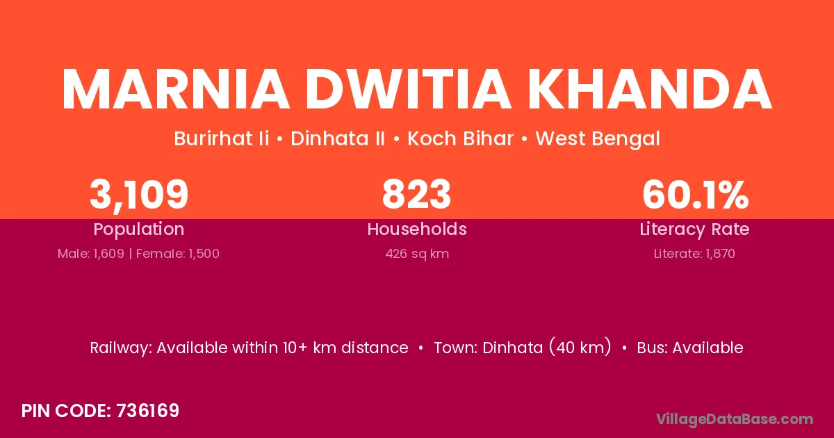 Dinhata (40 km) is the nearest town to Marnia Dwitia Khanda village for major economic activities and is located approximately 40 km away.