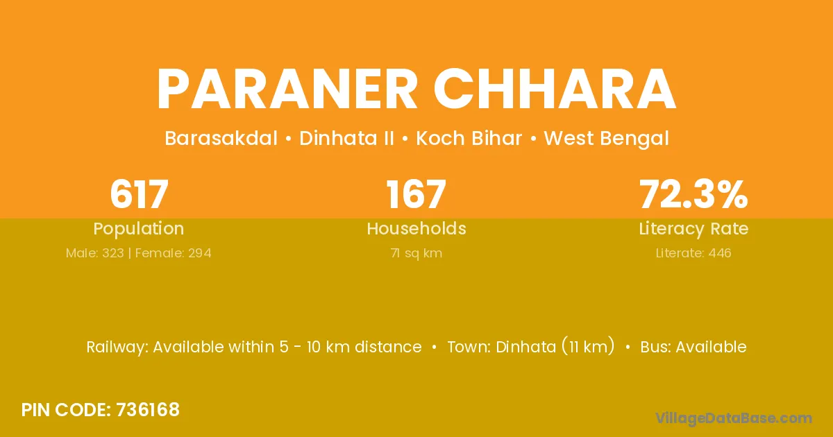 Dinhata (11 km) is the nearest town to Paraner Chhara village for major economic activities and is located approximately 11 km away.