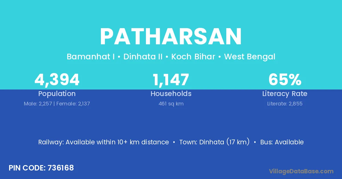 Dinhata (17 km) is the nearest town to Patharsan village for major economic activities and is located approximately 17 km away.