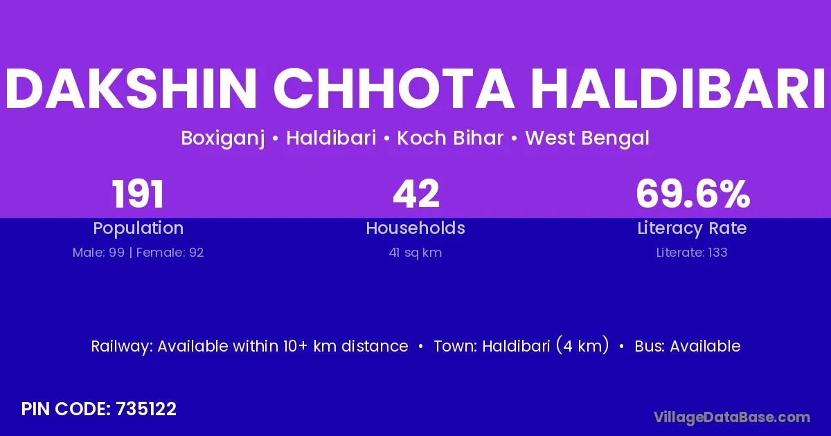 Dakshin Chhota Haldibari village has a total population of 191 people, of which 99 are males and 92 are females.