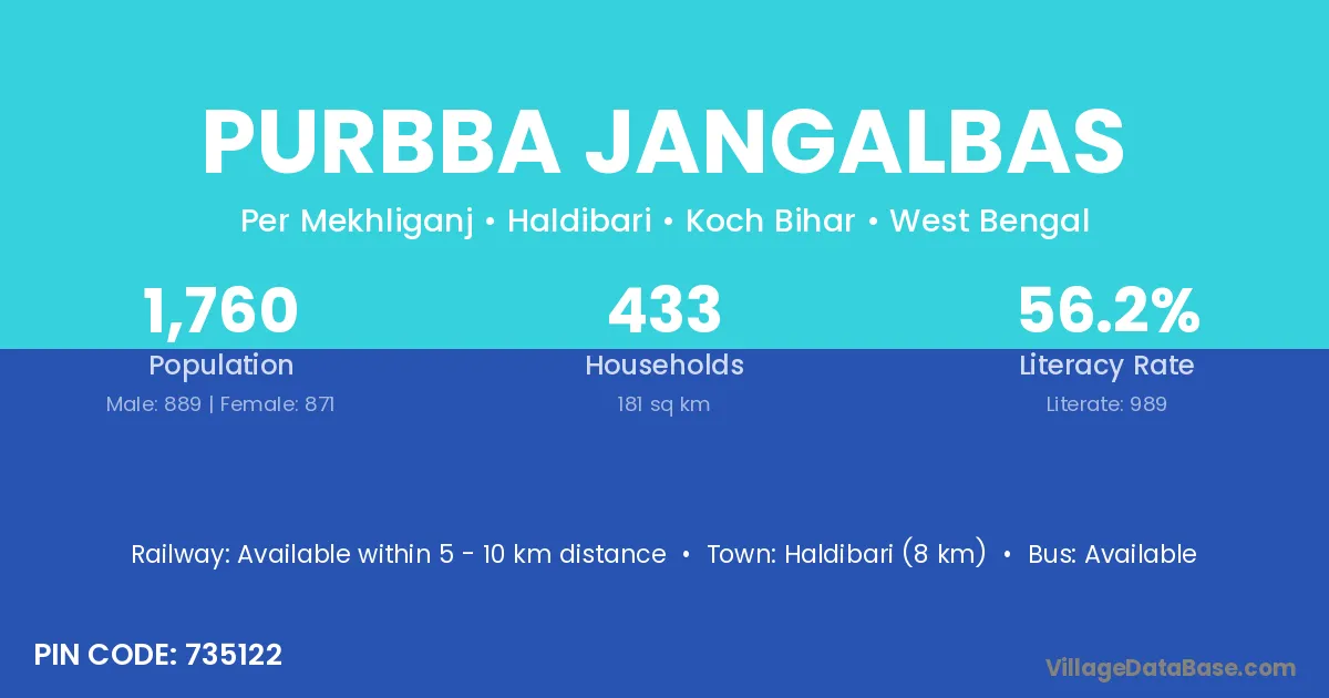 Haldibari (8 km) is the nearest town to Purbba Jangalbas village for major economic activities and is located approximately 8 km away.
