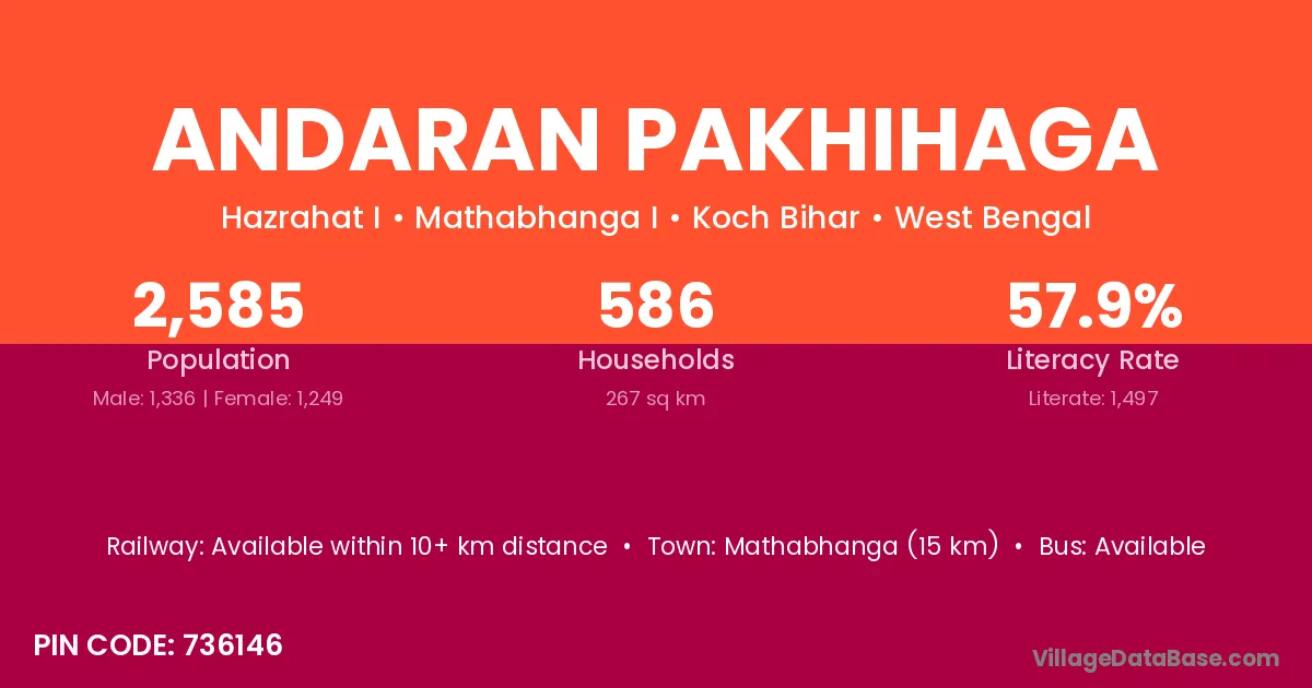 Mathabhanga (15 km) is the nearest town to Andaran Pakhihaga village for major economic activities and is located approximately 15 km away.