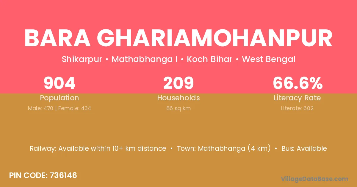 Mathabhanga (4 km) is the nearest town to Bara Ghariamohanpur village for major economic activities and is located approximately 4 km away.