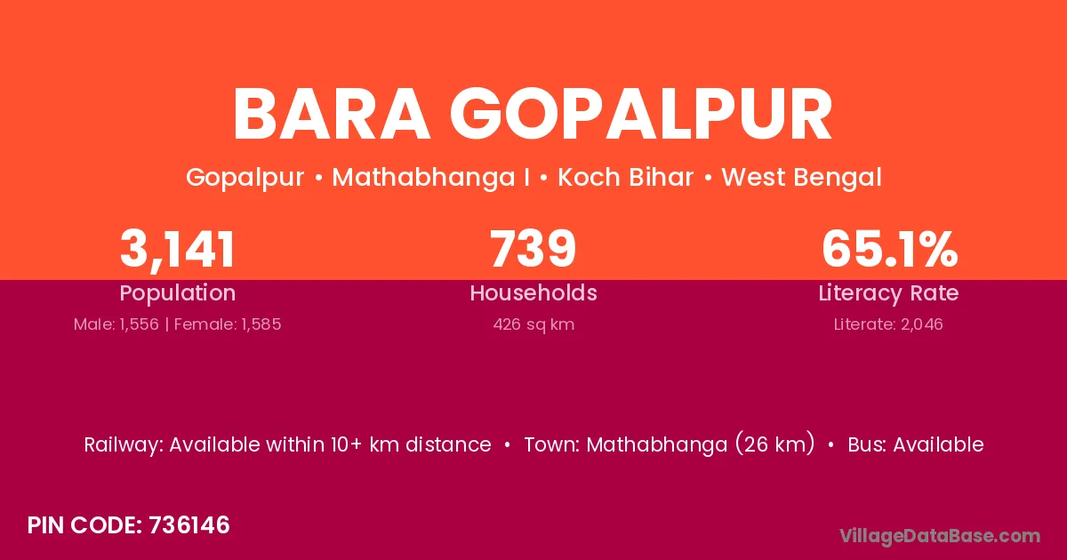 Mathabhanga (26 km) is the nearest town to Bara Gopalpur village for major economic activities and is located approximately 26 km away.