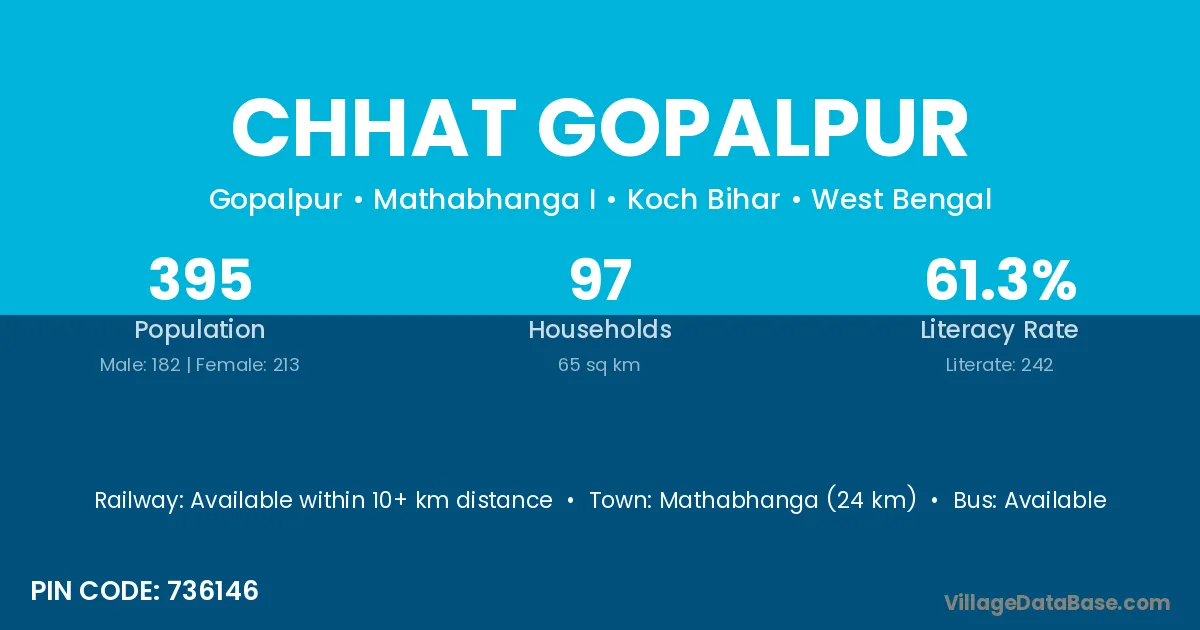 Mathabhanga (24 km) is the nearest town to Chhat Gopalpur village for major economic activities and is located approximately 24 km away.