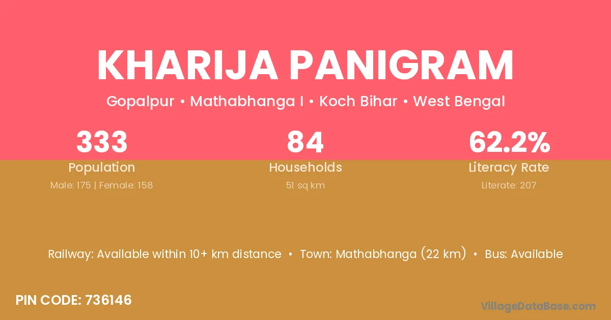 Mathabhanga (22 km) is the nearest town to Kharija Panigram village for major economic activities and is located approximately 22 km away.