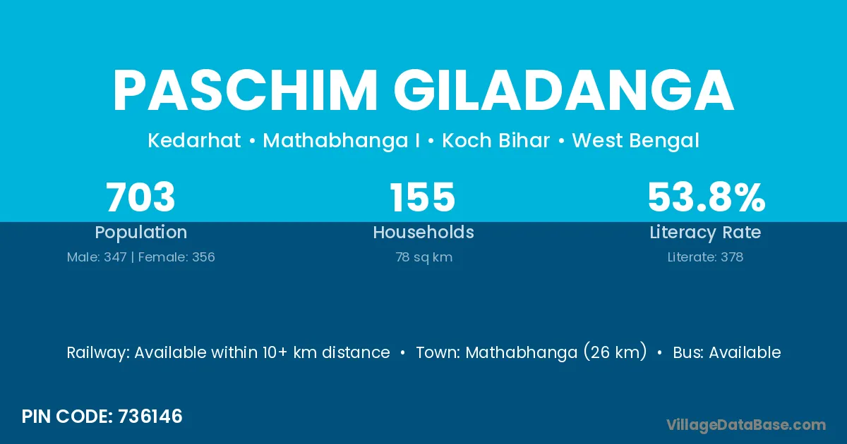 Mathabhanga (26 km) is the nearest town to Paschim Giladanga village for major economic activities and is located approximately 26 km away.