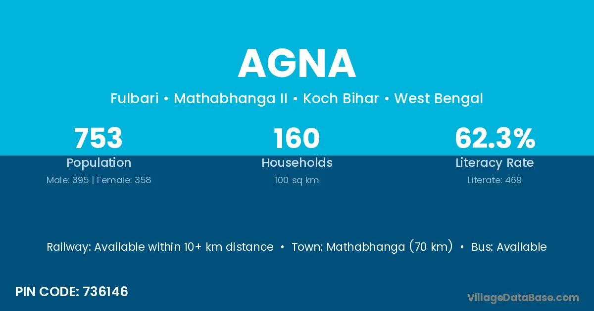Mathabhanga (70 km) is the nearest town to Agna village for major economic activities and is located approximately 70 km away.