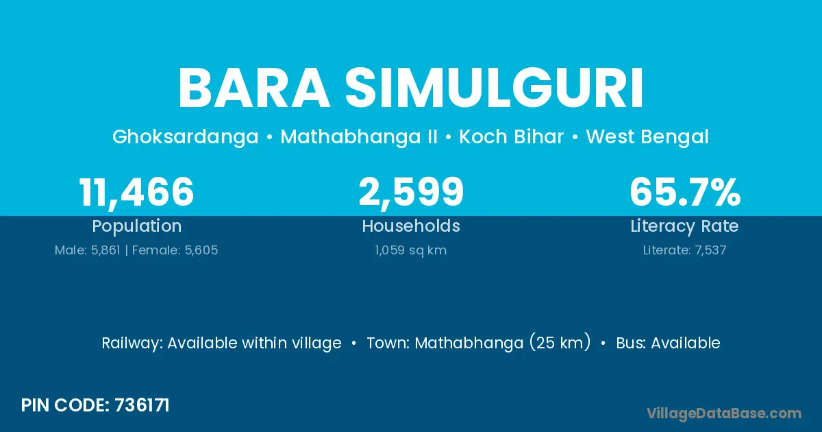 Mathabhanga (25 km) is the nearest town to Bara Simulguri village for major economic activities and is located approximately 25 km away.