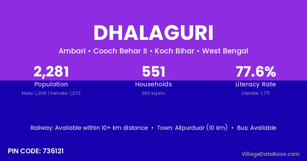 Mathabhanga (22 km) is the nearest town to Dhalaguri village for major economic activities and is located approximately 22 km away.