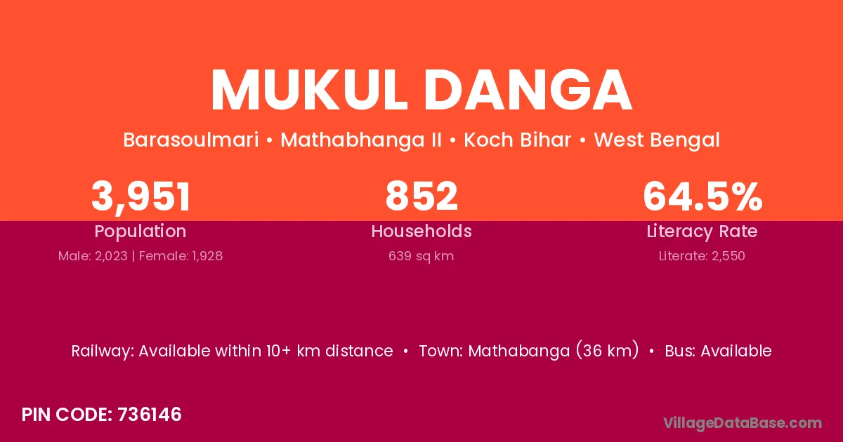 Mathabanga (36 km) is the nearest town to Mukul Danga village for major economic activities and is located approximately 36 km away.