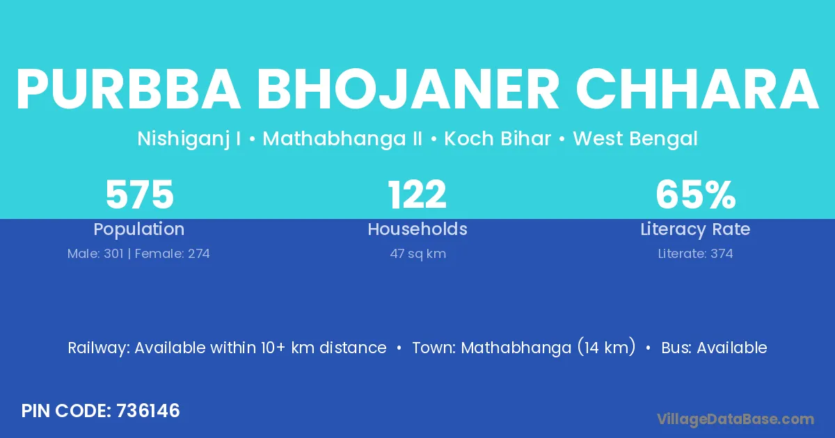 Mathabhanga (14 km) is the nearest town to Purbba Bhojaner Chhara village for major economic activities and is located approximately 14 km away.