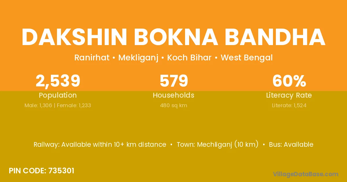 Dakshin Bokna Bandha village has a total population of 2,539 people, of which 1,306 are males and 1,233 are females.