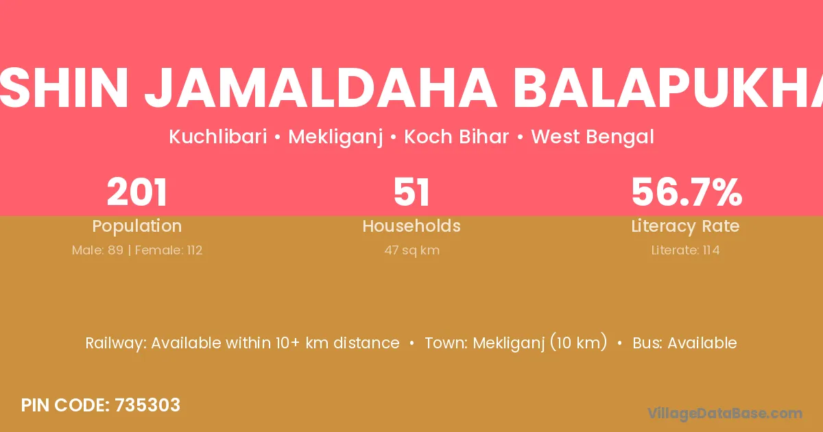 Dakshin Jamaldaha Balapukharia village has a total population of 201 people, of which 89 are males and 112 are females.