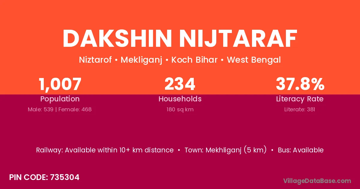 Dakshin Nijtaraf village has a total population of 1,007 people, of which 539 are males and 468 are females.
