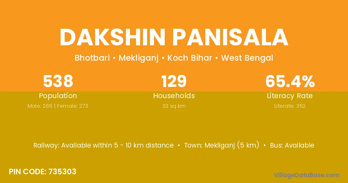 Mekliganj (5 km) is the nearest town to Dakshin Panisala village for major economic activities and is located approximately 5 km away.