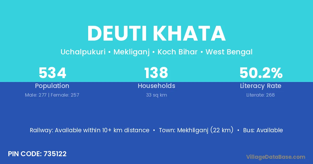 Mekhliganj (22 km) is the nearest town to Deuti Khata village for major economic activities and is located approximately 22 km away.