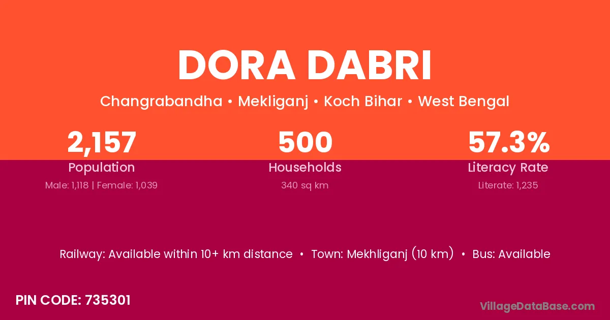 Mekhliganj (10 km) is the nearest town to Dora Dabri village for major economic activities and is located approximately 10 km away.