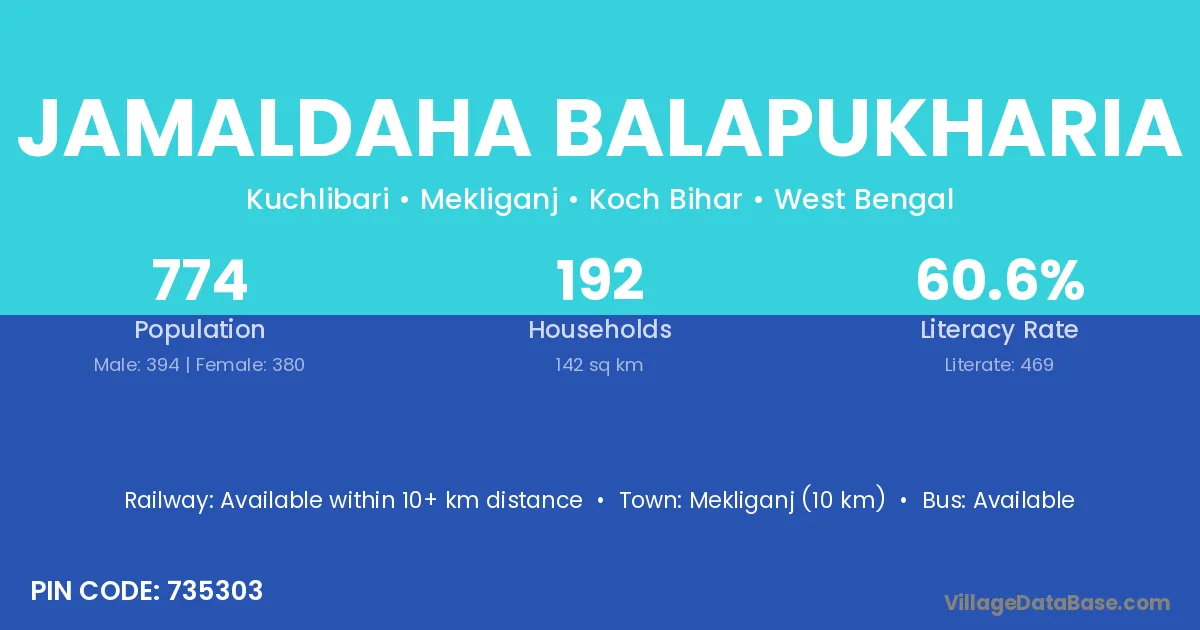 Jamaldaha Balapukharia village has a total population of 774 people, of which 394 are males and 380 are females.