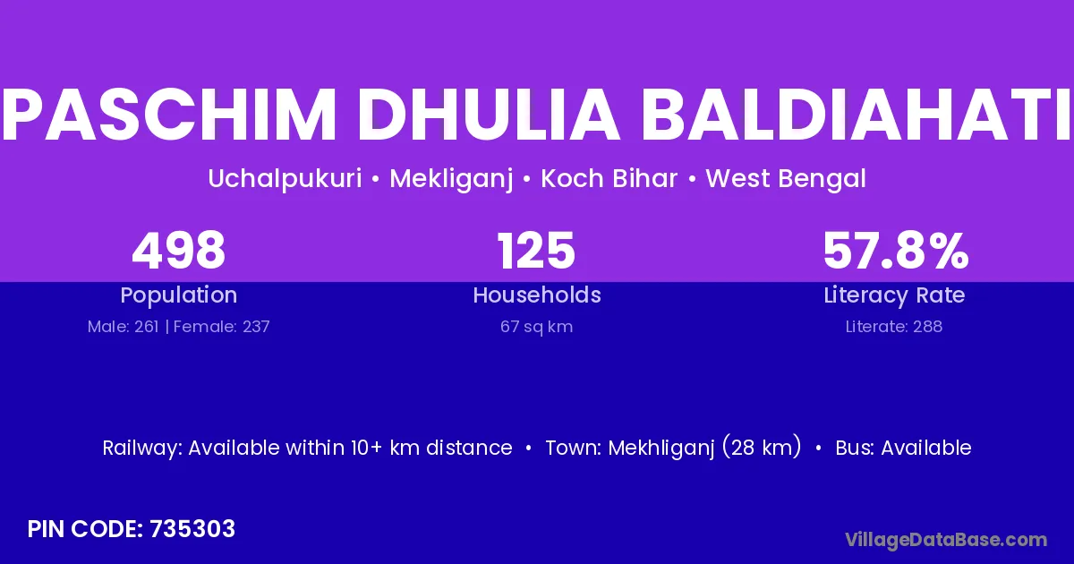 Paschim Dhulia Baldiahati village has a total population of 498 people, of which 261 are males and 237 are females.