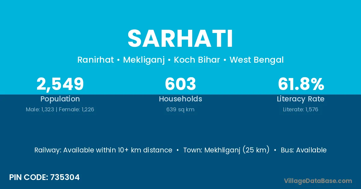 Mekhliganj (25 km) is the nearest town to Sarhati village for major economic activities and is located approximately 25 km away.