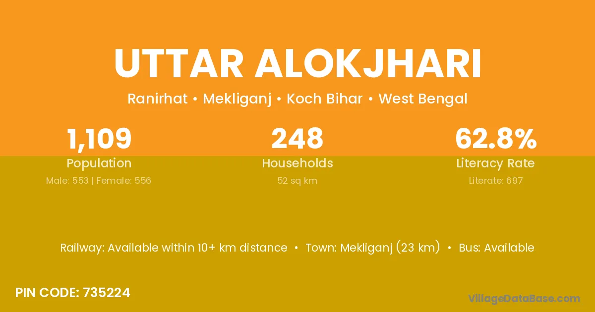 Uttar Alokjhari village has a total population of 1,109 people, of which 553 are males and 556 are females.