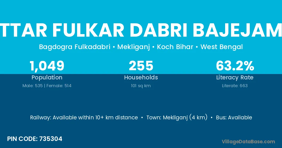 Mekliganj (4 km) is the nearest town to Uttar Fulkar Dabri Bajejama village for major economic activities and is located approximately 4 km away.