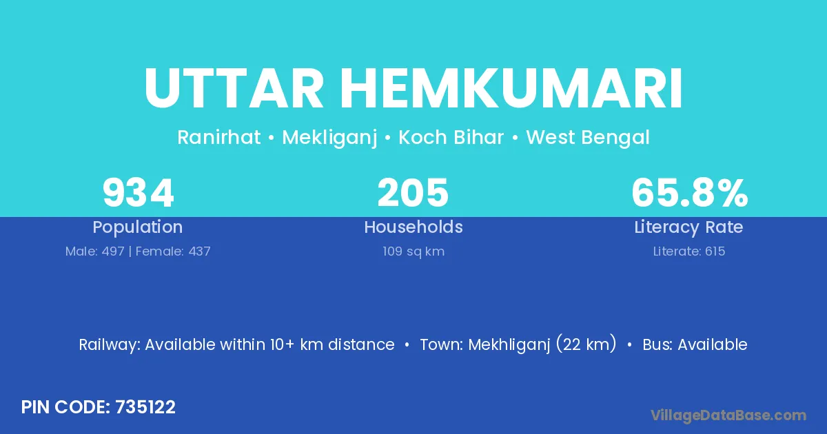 Mekhliganj (22 km) is the nearest town to Uttar Hemkumari village for major economic activities and is located approximately 22 km away.