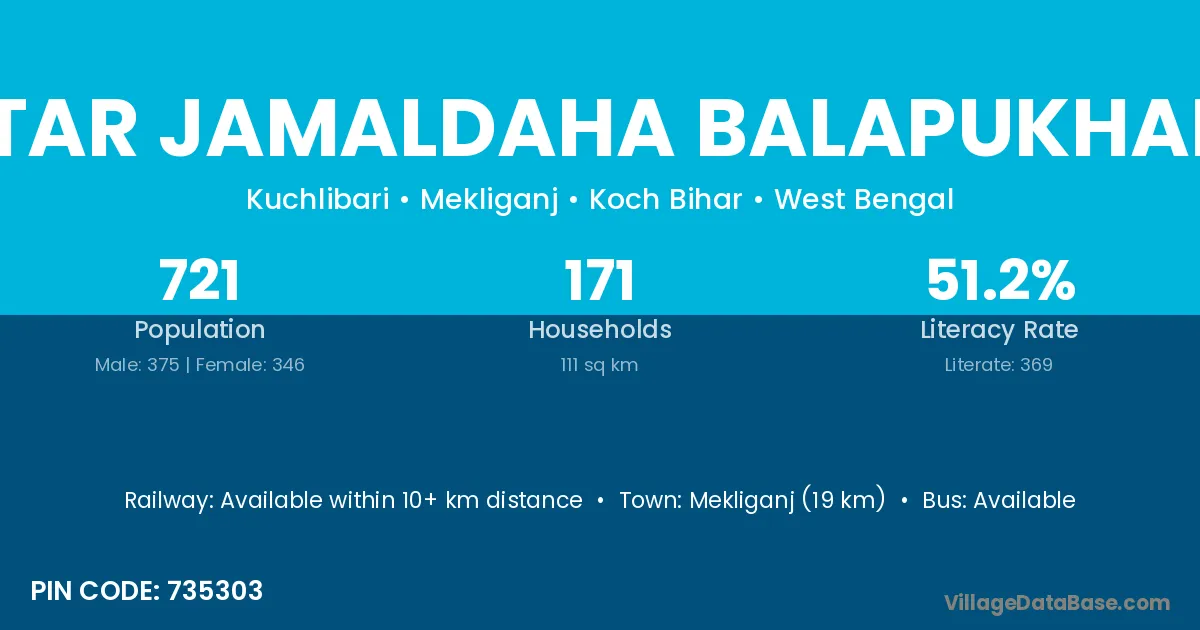 Mekliganj (19 km) is the nearest town to Uttar Jamaldaha Balapukharia village for major economic activities and is located approximately 19 km away.